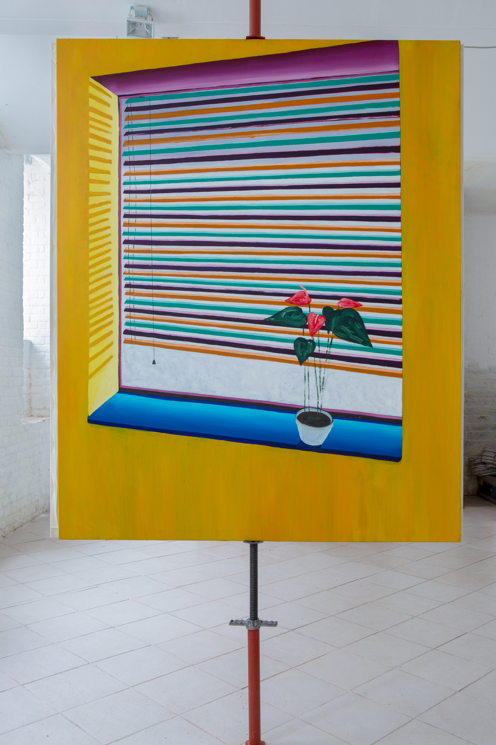 Nicht weit von mir sehe ich einen Rasen und am Rande des Rasens Stühle. Durch das Fenster fällt dasSonnenlicht und unterteilt das Innere in Helles und Dunkles. Der Boden, das Fußende des Bettes, die Wand und die Socken werden angeschienen. Sie fühlen sich ertappt. Eben noch waren sie, wie wenn mandurch ein Schlüsselloch schaut, von den anderen unbemerkt; jetzt sichtbar, sich erklärend und etwasverwirrt. Nur die Anthurie auf der Fensterbank ist durch Gewohnheit sich ihrer Rolle sicher.